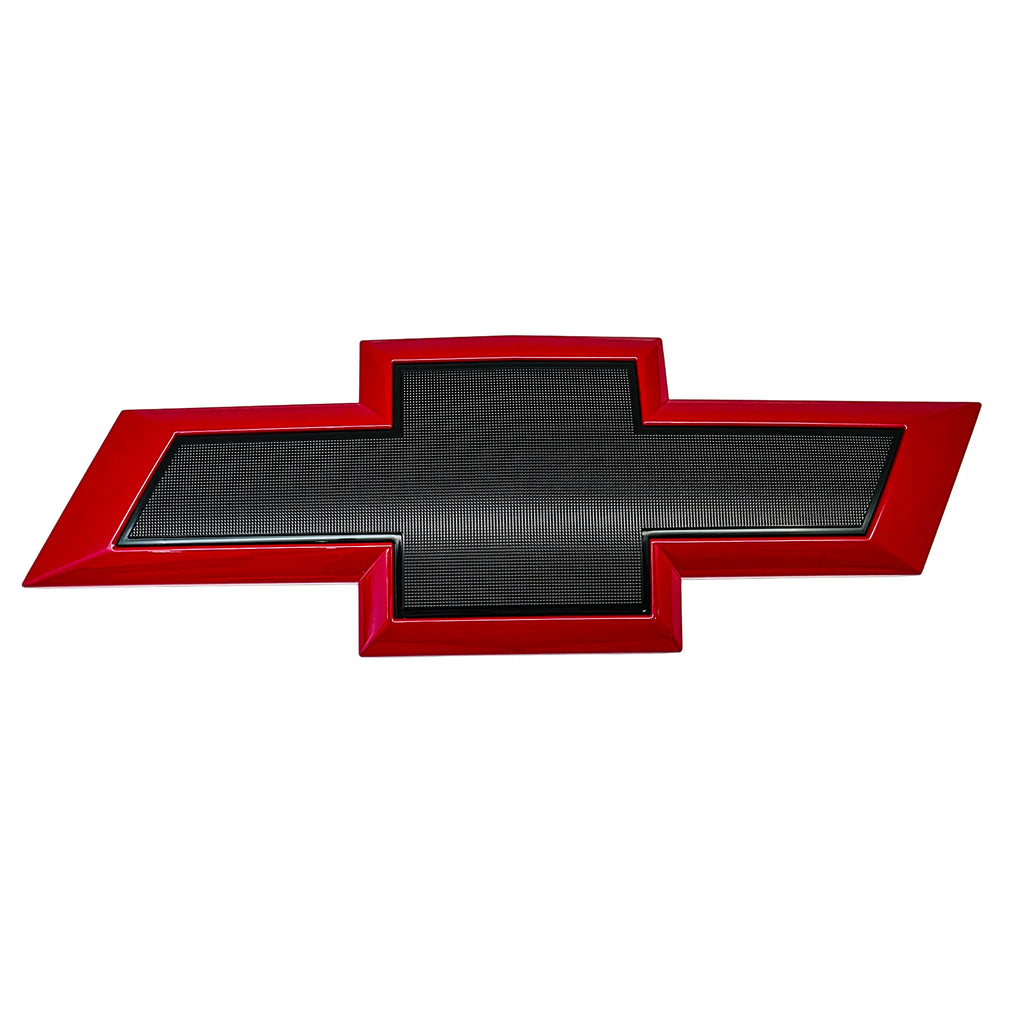 Upgrade your Chevrolet Silverado 1500 with this factory GM front bowtie emblem, hand-prepped and customized in the U.S.A. by our small business. Each emblem begins as a Genuine OEM part and is refinished with a Torch Red outer border while retaining the factory black inner finish, creating a bold contrast that delivers a distinctive blackout look with a vibrant pop of color.